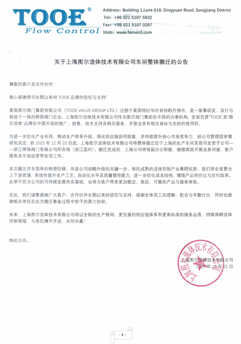 關(guān)于上海圖爾流體技術(shù)有限公司車間整體搬遷的公告